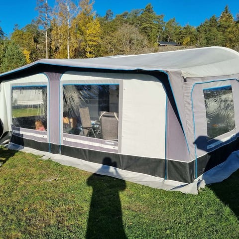 Förtält till husvagn i grått och svart utförande. Tältet har stora fönsterpartier med klar plast på front och sidor samt helhöga väggar. Ingång finns via dörr i sidoväggen. Stativ i metallrör och tillhörande tältpinnar ingår. Passar som extra uterum vid husvagnssemester och ger skydd mot vind och väder. Monteras längs husvagnens sida med stödben och tältlinor enligt standardlösning för förtält. Dorema förtält 400x240 inget A-måttstält passar alla husvagnar. Ingår vintersäkringspinnar med andra ord kan användas året runt. Nypris 15000kr ingår även gardiner och tältpinnar