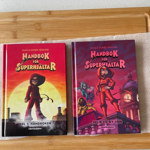 Elias & Agnes Våhlund Handbok för superhjältar bokserie del 1–10. Paket med tio inbundna böcker i serien, med färgillustrerade omslag. Böckerna följer samma format och utgåva och är numrerade från 1 till 10 på ryggarna. Passar som högläsning eller egenläsning för barn i låg- och mellanstadieåldern. Serien är på svenska.