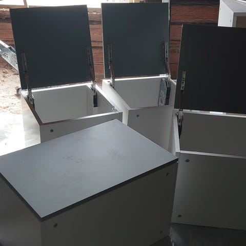 Köksluckor från IKEA faktum serien i träimitation med horisontell ådring och svarta handtag. Flera luckor i storlekarna: