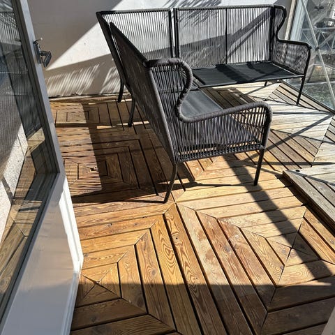 9kvm träplattor för trall. Varav ca 7 kvm i bra skick, osågat osv. Storlek är 30x30 per platta. Märke okänt men skulle gissa på arkacia trä med samma klick system som Clas Ohlson eller rusta. Dem kommer bli fina om man sopar av och oljar upp dem. Testade på en platta för att se.