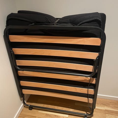 Smidig extrasäng som går enkelt att fälla ihop. Madrass i bra skick medföljer.
