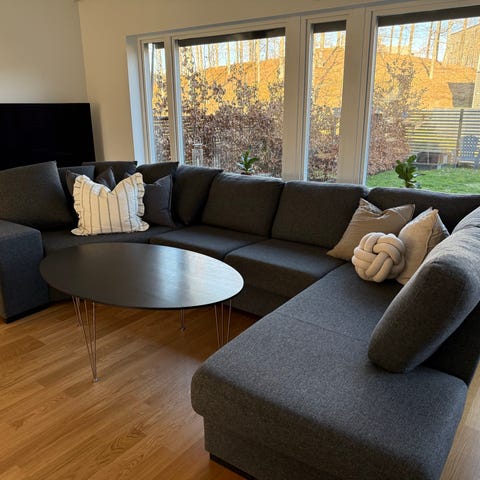 Avtagbart nackstöd ingår som passar både soffa och fåtölj. Soffa 4000 kr. Fåtölj 1000 kr. Varsamt använd. Fåtölj 93 cm bred, 90 cm djup.