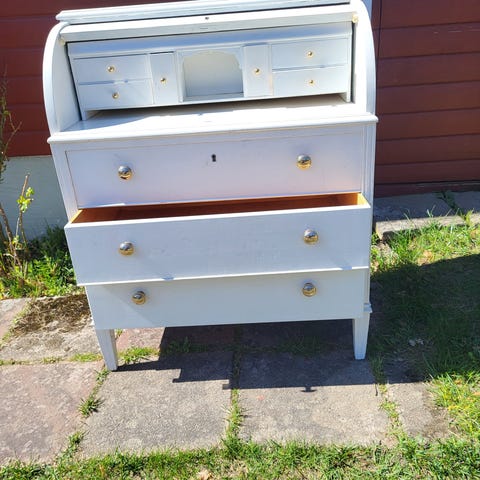 Vit sekretär med klaff som skrivyta. Invändigt finns mindre lådor och fack för förvaring. Under klaffen finns två större utdragslådor med runda beslag. Möbeln står på svängda ben och har en klassisk stil. Passar som skrivbord eller förvaringsmöbel i exempelvis vardagsrum, sovrum eller hall.
