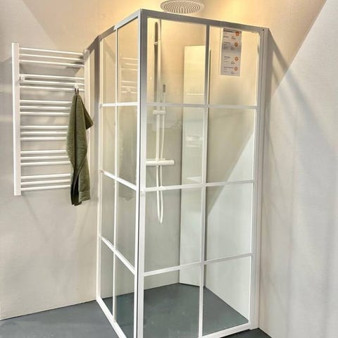 Duschkabinen är använd ca 2 år. Duschkabin med glasväggar och metallram. Kabinen har hörnplacering med skjutdörrar och duschset med handdusch. Golvkar i ljus färg med upphöjd kant. Passar för installation i badrum eller tvättstuga där en fristående duschlösning önskas.