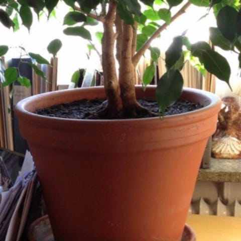 Bougainvillea krukväxt med rosa blommor. Växten står i en mindre lerkruka med barkliknande jordmaterial. Flera sammanflätade stammar ger ett buskigt växtsätt med gröna blad och tydliga rosa högblad runt de små blommorna. Passar som prydnadsväxt inomhus eller utomhus under varmare perioder, på exempelvis balkong, uteplats eller i växthus. Kräver ljus placering och regelbunden vattning efter behov.