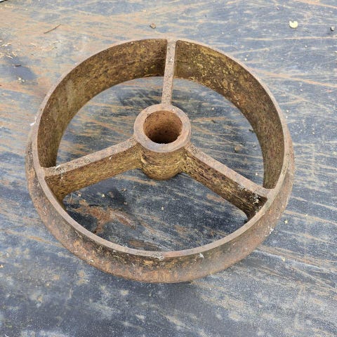 Vagnshjul med järnskodd slitbana. Diameter ca 800 mm. Total höjd ca 230 mm. Dock saknas 1 st träeker. Borde gå att återskapa.