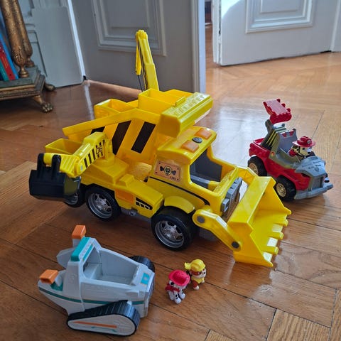 Paw Patrol bil "Paw Patrol Basic Vehicle 2.0 - Rubble". Figuren som kommer med är lite mindre än original. Längd på bilen ca 16 cm. Lekt med men fullt fungerande. Vissa klistermärken lite bortskavda (se bilder). Kan finns mindre skav och smuts som lätt torkas bort.
