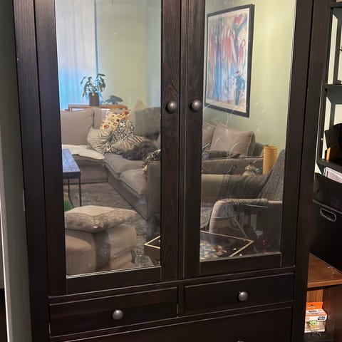 Vitt ikeaskåp Hemnes med två dörrar. Klädstång för galgar.