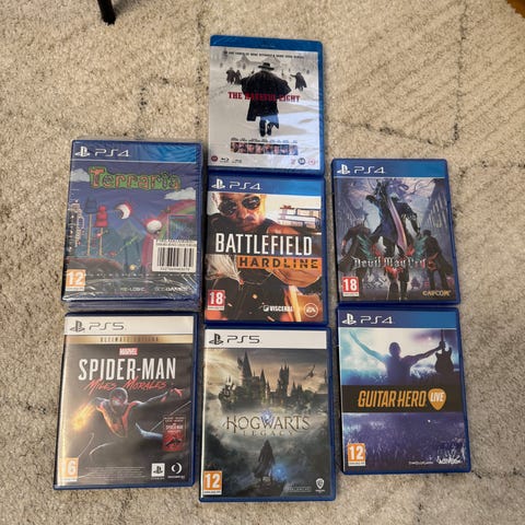 Playstation 4 spelpaket med flera olika titlar. På bilderna syns bland annat action-, sport-, äventyrs- och racingspel, inklusive spel med superhjältar, bilkörning, plattform och familjevänliga spel. Spelen levereras i sina originalfodral för PS4-formatet.