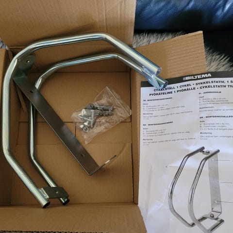 Cykelhängare för tak- eller väggmontering med 3 krokar för upphängning av cykel i hjul. Konstruktion i metall med röda krokar som håller cykeln på plats. Passar för förvaring av cykel i garage, förråd eller liknande utrymmen för att spara golvyta och ge en överskådlig förvaring. Ny, passade inte mitt utrymme. Se mått i bild. Nypris 2493kr