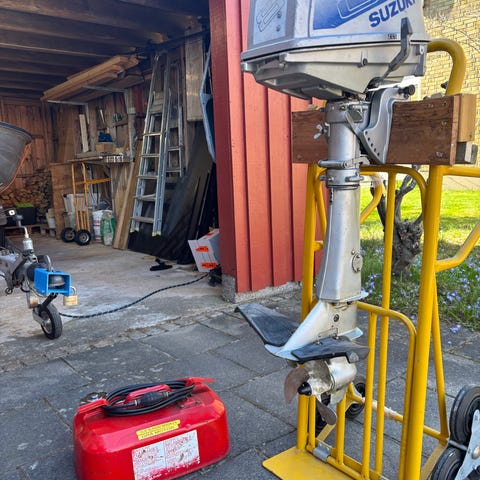 Chrysler båtmotor med trycktank och båtmotorkärra enligt bild.Fick den med vid båtköp och har bara startat den men den fungerar.
