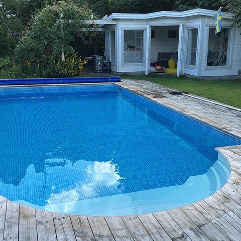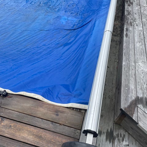 Folkpool poolöverdrag, komplett 4x8m med skenor och upprullningsanordning.