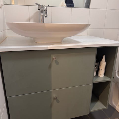 Fristående tvättställsskåp med handfat.