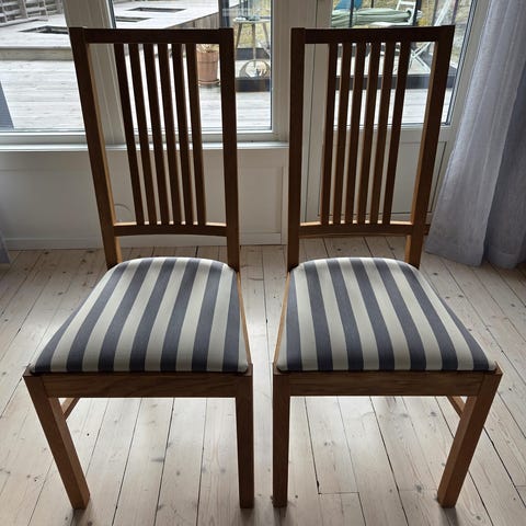 3 st stabila trästolar i massiv furu med naturfärgad yta. Stolen har ryggstöd med utskuret dekorativt mönster och en rak, fyrkantig sits. Passar som matstol eller extra sittplats i kök, vardagsrum eller matrum. 200 kr st eller 500 kr för alla 3.