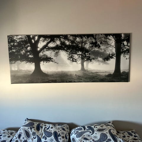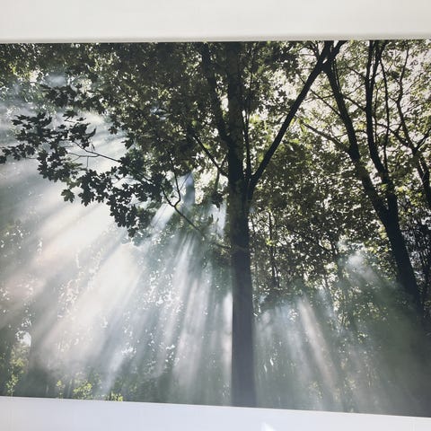 Mio tavla med skogsmotiv. Rektangulär väggdekoration med tryck av skog och solljus mellan träden. Passar som väggprydnad i till exempel vardagsrum, sovrum eller hall.