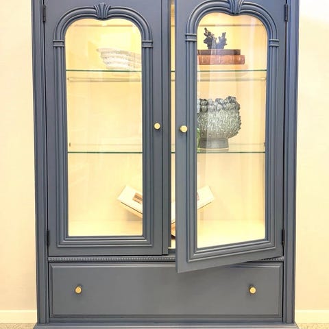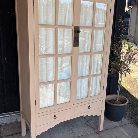 Vackert vitrinskåp i engelsk antik stil med fina detaljer och elegant spröjs. Varsamt handmålat med kvalitativ färg från Jotun i en lung grön kulör, insidan blev iklädd med Boråstapet ur kollektionen Anno med mönster inspirerad av Sveriges äldsta tapet från 1500- talet. Hyllplan är flyttbara och en nyckel i mässing finns.