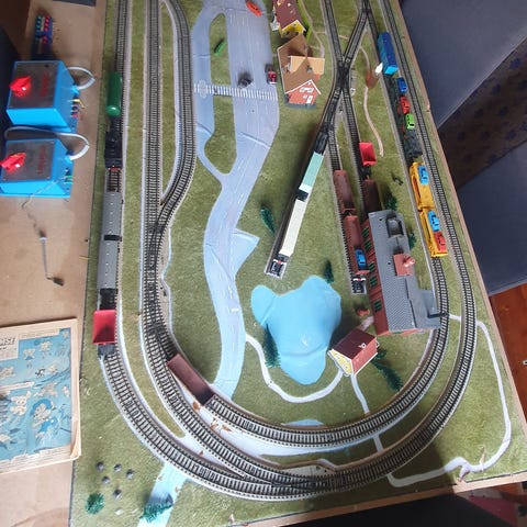 MÄRKLIN modelljärnväg tågset med flera lok, godsvagnar och personvagnar samt ett större antal rälsdelar i olika utföranden. I setet ingår raka och böjda rälsbitar, växlar samt en transformato. Vet inte vad som funkar. Endast transformatorn är testad och funkar utmärkt. Ett av loken har ingen släpsko. Växlarna är inte testade. Passar för uppbyggnad eller utökning av modelljärnvägsanläggning.