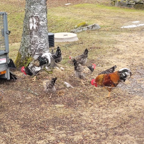 Grupp med två hönor och fem tuppar. Går tillsammans och fungerar bra ihop.