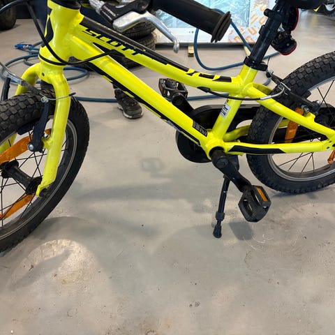Scott barncykel med 16" hjul i gul färg. Cykeln har fotbroms bak och handbroms fram, kedjeskydd, reflexer och justerbar sadel. Lämplig för barn som passar på en cykel med 16-tums hjulstorlek.