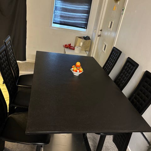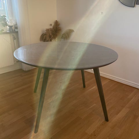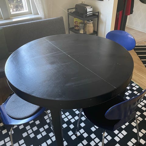 Ett svart runt matbord i tjockt trä med svarta stolar i läder. Säljes tillsammans. 120cm i diameter. Finns i Landskrona.