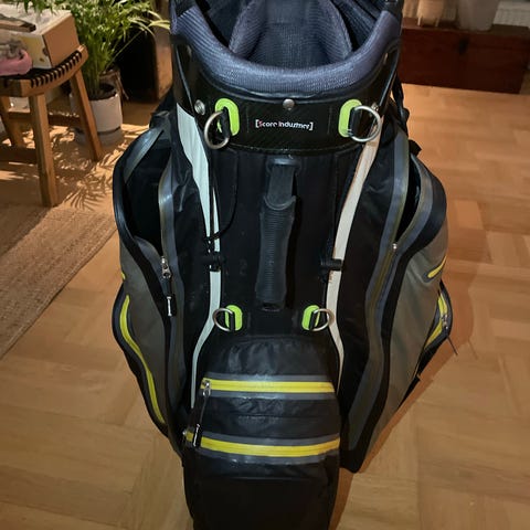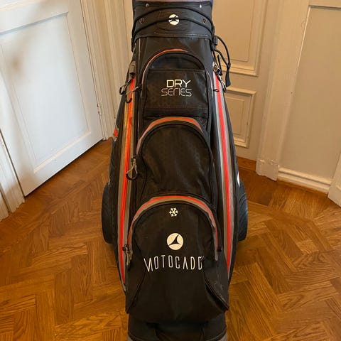 Motocaddy Dry Series golfbag i vit, svart och blå färg. Golfbagen är av vagnmodell med flera ytterfickor med dragkedja för förvaring av bollar, tillbehör och kläder. Överdelen har flera separata fack för klubbor för att hålla dem åtskilda och organiserade. Bagen har bärhandtag och medföljande regnöverdrag upptill. Passar för användning på golfvagn eller elvagn på golfbanan.
