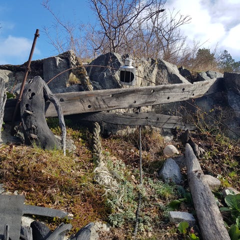 Skulpterat diorama med ett väderbitet utedass med mossa och gräsdetaljer. Inuti dasset finns ett träsktroll som inte har något dasspapper kvar.