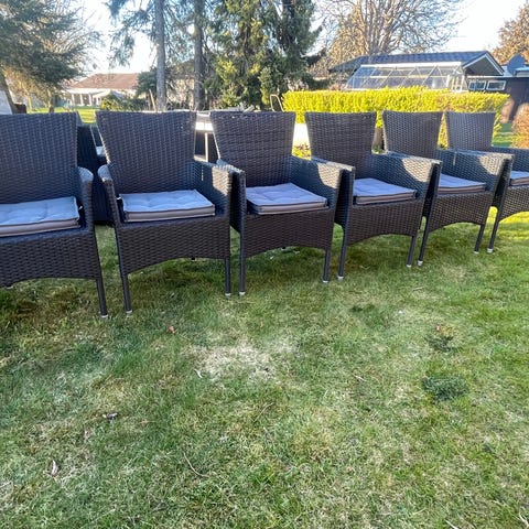 Vilstolar i rotting i vit färg. Stolarna har hög rygg och armstöd samt dekorativa detaljer i rottingen. Passar exempelvis i uterum, altan eller trädgård för sittplats och avkoppling.