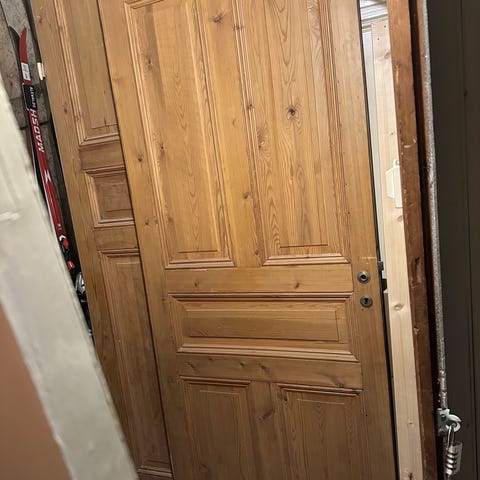 Den är inköpt från bygghemma för en månad sen. speglad dörr i obehandlad furu. 80x200.