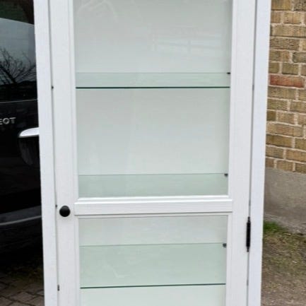 Säljer 2st vita vitrinskåp med glashyllor från XxlLutz som kan väggmonteras. Väldigt varsamt använda.