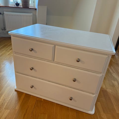 Säljer en vit byrå med 6 lådor från Ikea, märke HAUGA.