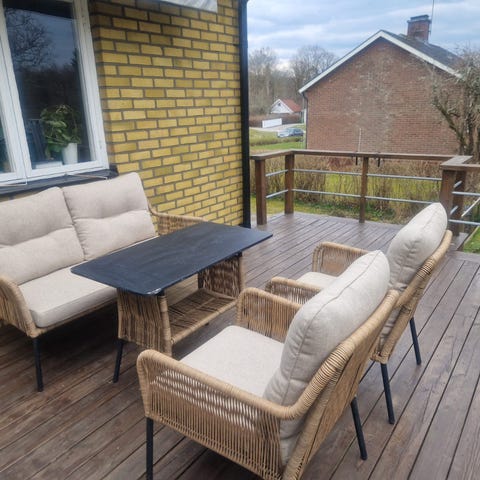 Rotting soffgrupp med ett rektangulärt glasbord och sittmöbler i rotting. Gruppen består av en tvåsitssoffa och två fåtöljer med armstöd. Dynorna har blommigt mönster i beige och gröna toner. Passar för uteplats, altan eller inglasad balkong. Bordet har skiva i strukturerat glas och underrede i rotting som matchar stommen på sittmöblerna.