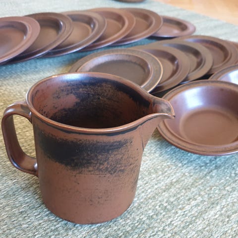 10st kaffekoppar med tillhörande fat ur serien Ruska ( design Ulla Procope).Klassisk finsk retroresign från 1960-70talet med den mörkbruna levande glasyren.Komplett set ;10 koppar +10 fat fint bruksskick.Hämtas i Bålsta
