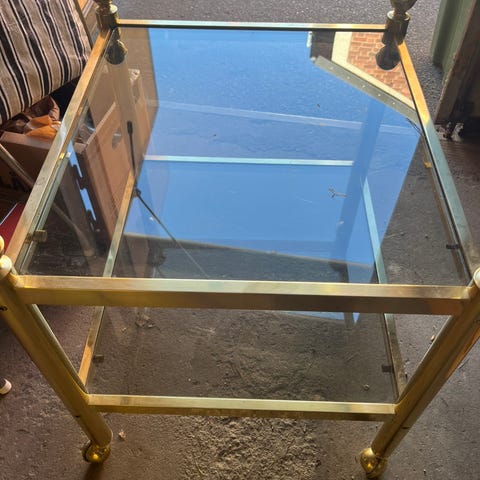 Rökfärgad glasskiva och guldfärgade ben. Litet märke I ena hörnet (se bild)