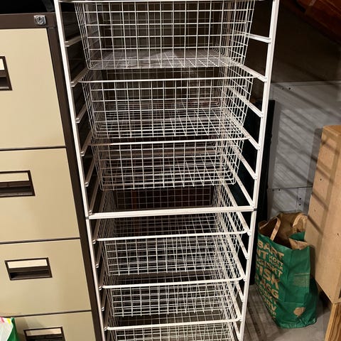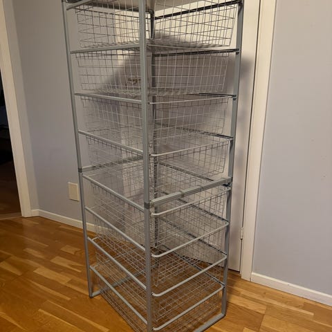 Det finns 7 st sektioner som vardera har 10 trådbackar och ett hyllplan överst.