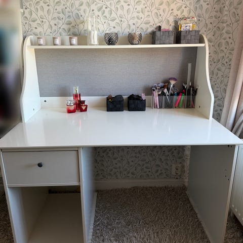 Säljer ett fint och stabilt skrivbord från IKEA (HEMNES-serien) med tillhörande överhylla.