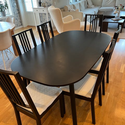 Ovalt matbord i vitpigmenterad ek med tålig bordsskiva i laminat, mått 200x102 cm. 6 stolar, vitpigmenterad ek med klädd sits (några fläckar på klädseln) Märke Rowico, Yumi. Finns i centrala Varberg