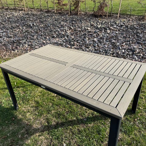 Matgrupp för utomhusbruk bestående av rektangulärt bord och 4 stolar. Bordsskivan har träliknande yta i ljus beige ton och står på svarta ben. Stolarna är flätade i beige material med svarta ben.Är från Rusta.Använda en säsong.Bord L 140 H 80 B 74.Stolar L 56 H 61 B 85. Pris 3000 kr.