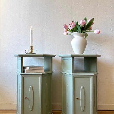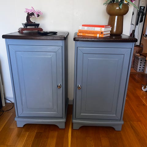 Jag har två stycken antika vackra sängbord målade i en ljus varmbeige färg. Köpta på re:deco och är målade av little paint november 2025. Ena sängbyrån har lådor och den andra byrån har hyllplan. Nyckel finns kvar till byrån.