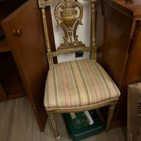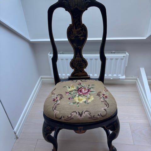 En stol i trä med stoppad sits i beige tyg med blommigt broderi. Träramen har svängda ben och rundad rygg med dekorativa detaljer.