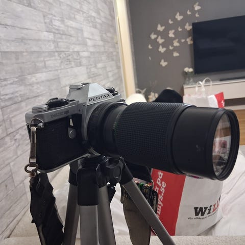 Pentax systemkamera med utbytbara objektiv. Kameran levereras tillsammans med flera objektiv, ett löst objektivlock samt en kameraväska i mörkt material. Utrustningen passar för allmän fotografering och kan användas både för vardagsbilder och mer avancerad fotografering där olika brännvidder behövs. Exakta modellbeteckningar och tekniska specifikationer framgår inte av underlaget och bör kontrolleras vid behov.