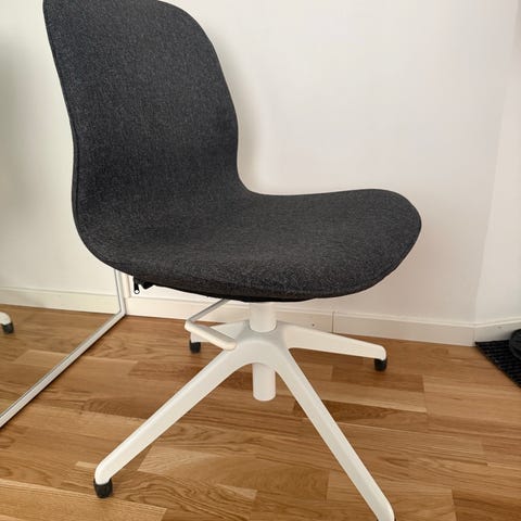 IKEA kontorsstol för barn med hjul. Stolen har vit metallram och femstjärnigt underrede med plasthjul. Sits och rygg är stoppade och klädda i mörkgrått tyg. Höjden är justerbar. Passar som skrivbordsstol i barnrum.