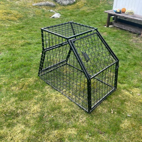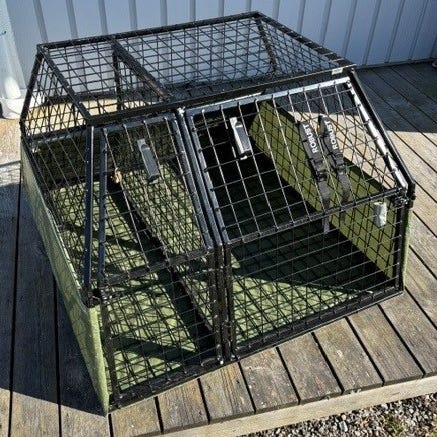 Robust hundbur i svart metallgaller. Buren är utformad för placering i bilens bagageutrymme med sned bak- och framsida som följer bilens lastutrymme. Den har dörr med låsanordning bakåt samt extra nödutgång framåt. Anpassade spännband och vädringskrok ingår. Passar för transport och säker förvaring av hund i bil. Den är gjord för Toyota RAV 4.