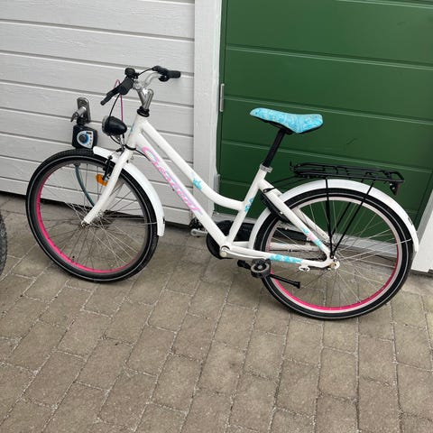 Cykel från Btwin som passar ca 7-11 års ålder. Cykeln är svart med rosa detaljer och dekormönster, handbroms fram och bak, ringklocka och avtagbar korg (ser konstig ut på bilden men är bara vinklad neråt)