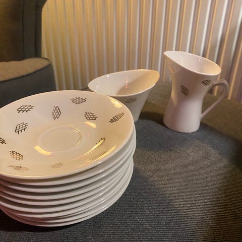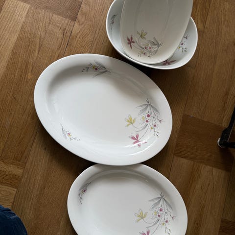 Komplett set med store och lite tallrikar, sås och soppset och mycket fat