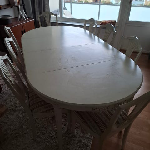 Leksandstolar 6 stycken med tillhörande bord samt två iläggsskivor, längd ca 2 meter med iläggsskivor.