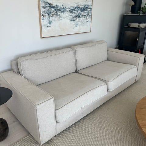 3-sits soffa från Jotex i modellen Sarbonne. Är använd ca 1 år. Fint skick, inga skador eller hål. Lite ojämn fyllning i dynan men tycker det har varit så sedan början, man behöver ”puffa” till sittdynan ibland. I övrigt väldigt skön och fin soffa.