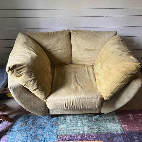 Svart trä fåtölj från jotex med ljusgrått tyg.