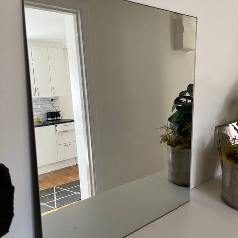 Rektangulär spegel med plan spegelyta. Passar till exempel i hall, sovrum eller vardagsrum, antingen stående mot vägg eller upphängd. Neutral design som fungerar i olika typer av inredningar. H 100 cm, B 38 cm.