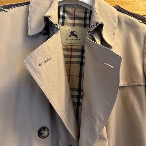 Hej! Säljer en Burberrys trench coat från vad jag skulle gissa på är från 60 talet. Den är i nästan nyskick utan fläckar och endast ett pyttelitet hål i högerfickan. Den kommer med ett bälte och Burberrys hängare om det önskas. Den är gjord av kamelhår och ull och är i en snygg svart/marinblå färg. Osäker på storlek men om man är intresserad kan jag nog skicka mått.