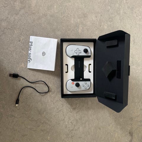 Trust GXT Mylox trådlös mobilkontroll med bluetooth-anslutning. Kontrollen är utformad för spel på mobiltelefon och fungerar med både Android och iOS enligt förpackningen. Den har två analoga styrspakar, riktningsknappar, axelknappar och färgmarkerade funktionsknappar. Kontrollen har utdragbar hållare för smartphone så att telefonen sitter fast under spel. I paketet ingår originalkartong, förvaringspåse och användarguide enligt bilderna.